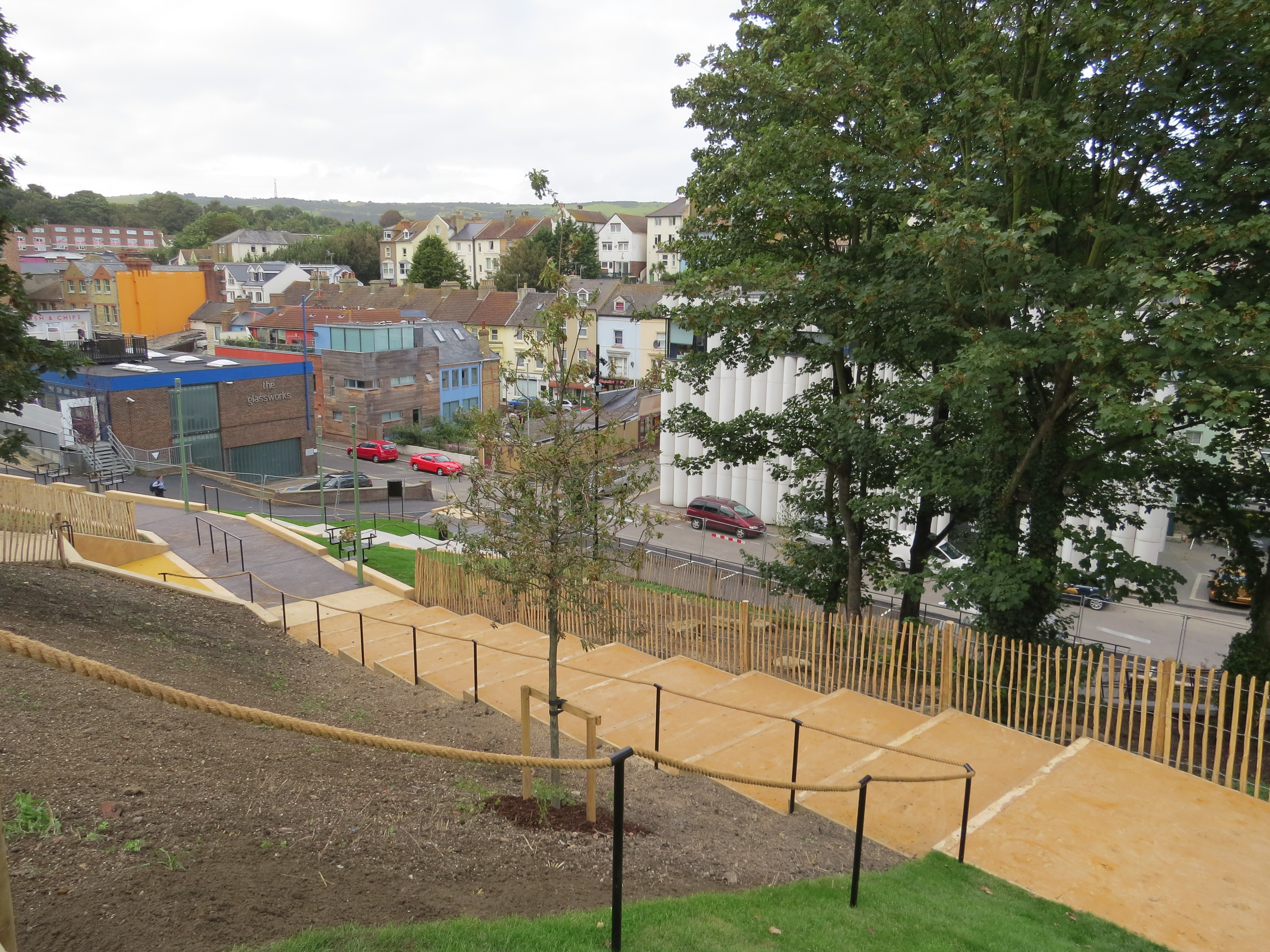 Payers Park, designed by urban design specialists muf architecture/art, provides a place to play, exercise and relax for Folkestone’s residents, visitors and shoppers. The brief was to create a new focal point for the community that would act as a safe access link through the town centre.Set in a steep sloping valley side, Payers Park required the use of heavy building materials with the structural capabilities to cope with the complexities of the site. Colour and aesthetic were important considerations in developing its exposed structures, which needed to closely match local clays and sandstones in the town, such as Greensand and Gault clay.
