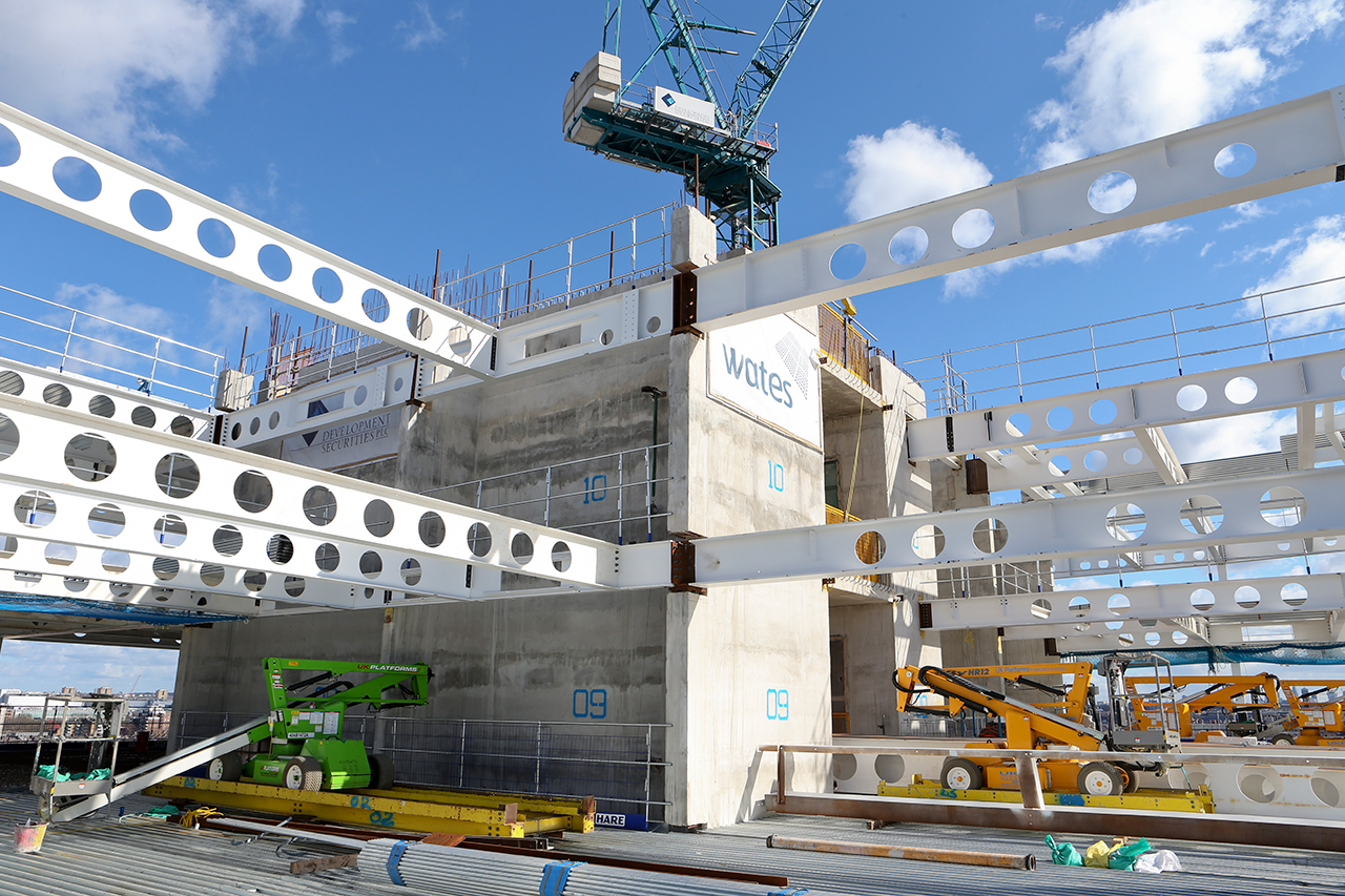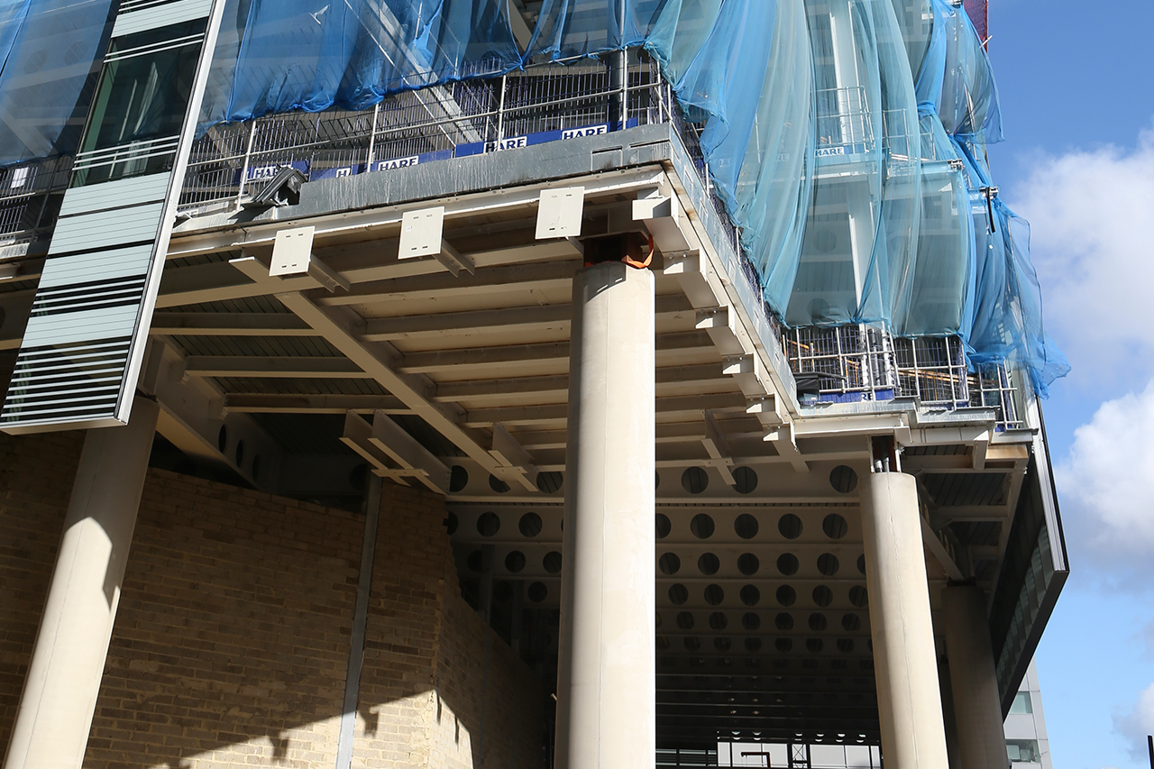 The restricted head room and tight nature of the site meant that traditional steel forms were impractical. After careful consideration, a bespoke polystyrene mould with ABS liner was chosen along with a high quality self-compacting concrete mix from Hanson. 100mm diameter well-void tubes with holes at 300 centres were placed in each column to form a sacrificial tremie pipe, ensuring any issues relating to the segregation of the concrete during the placement process were overcome.
