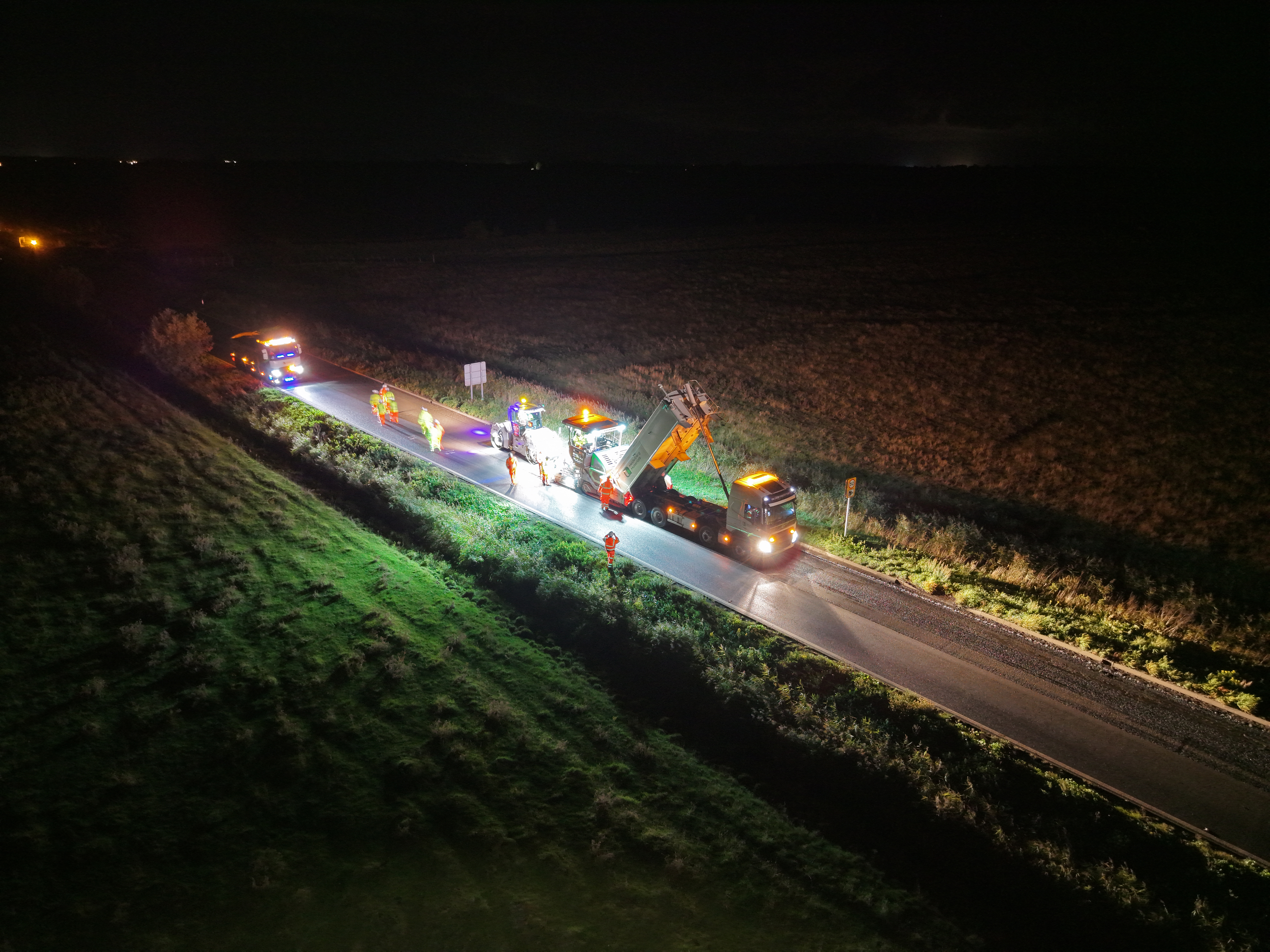 Ten miles of the A47 Acle Straight (Acle to Beccles Interchange) near Great Yarmouth in Norfolk has been resurfaced using a range of carbon reduction measures including foamed asphalt, high levels of recycling and the use of electric plant.