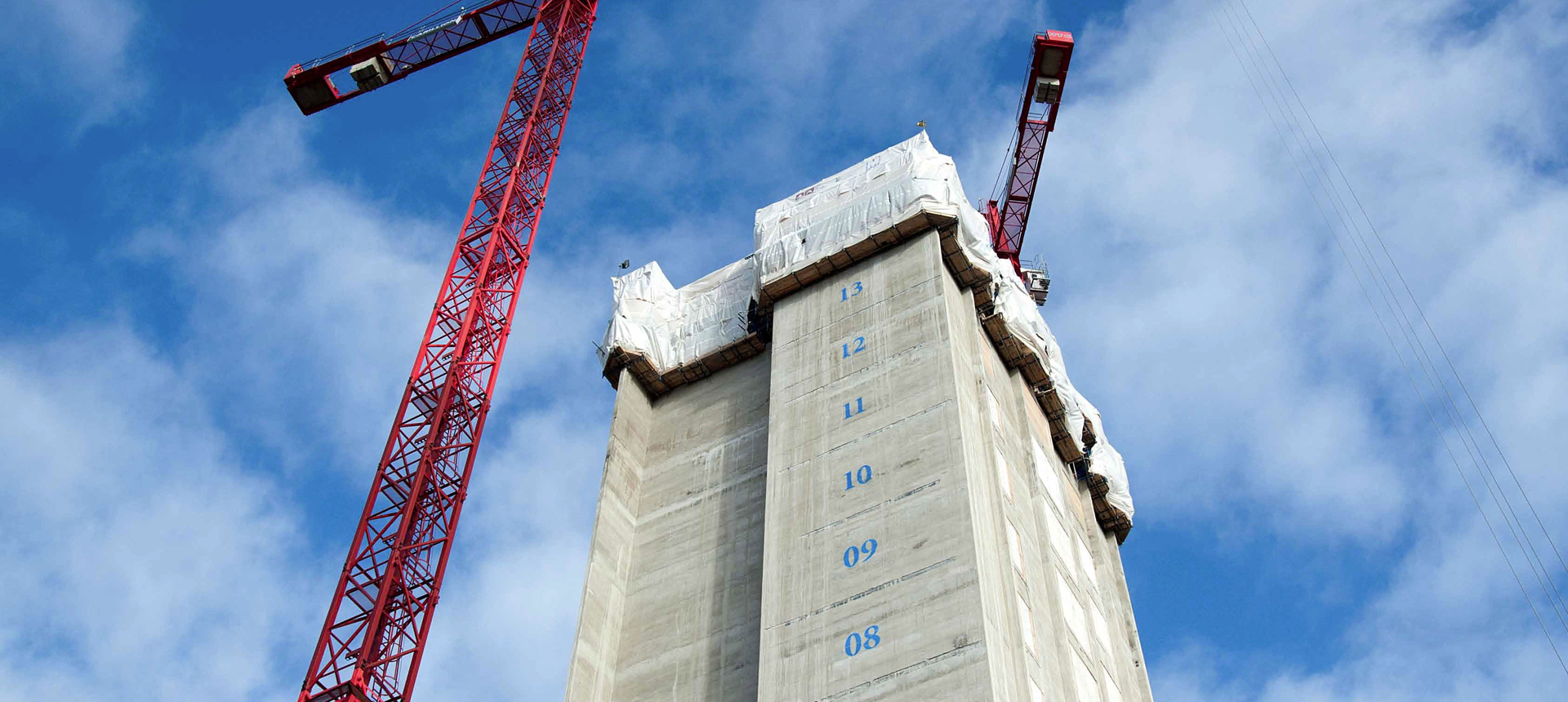 The concrete core, which will incorporate eight lifts, has been constructed using slipform construction. Slipform construction involves vertically raising self‑contained formwork on hydraulic jacks, while extruding the reinforced concrete section. It is a fast and cost effective solution suitable for the construction of core walls such as lift shafts in high‑rise buildings.