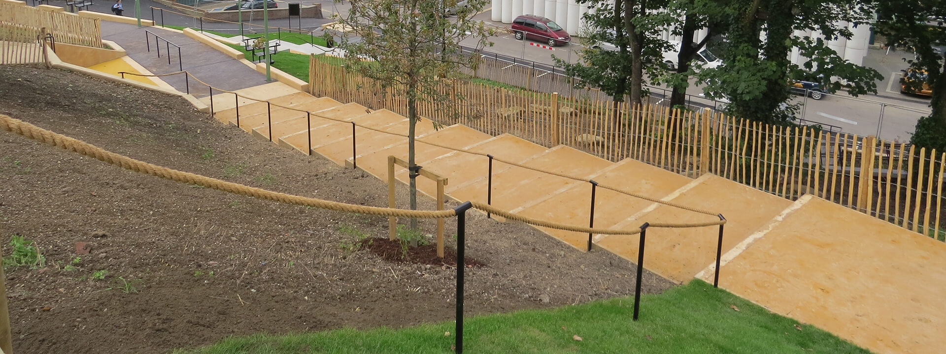 All three colours were incorporated in the park’s retaining walls – which give the appearance of ruins or excavations hidden under deposits of soil. The walls, which sit within the site’s slopes, were used to support levelled areas where accessible public routes have been created.