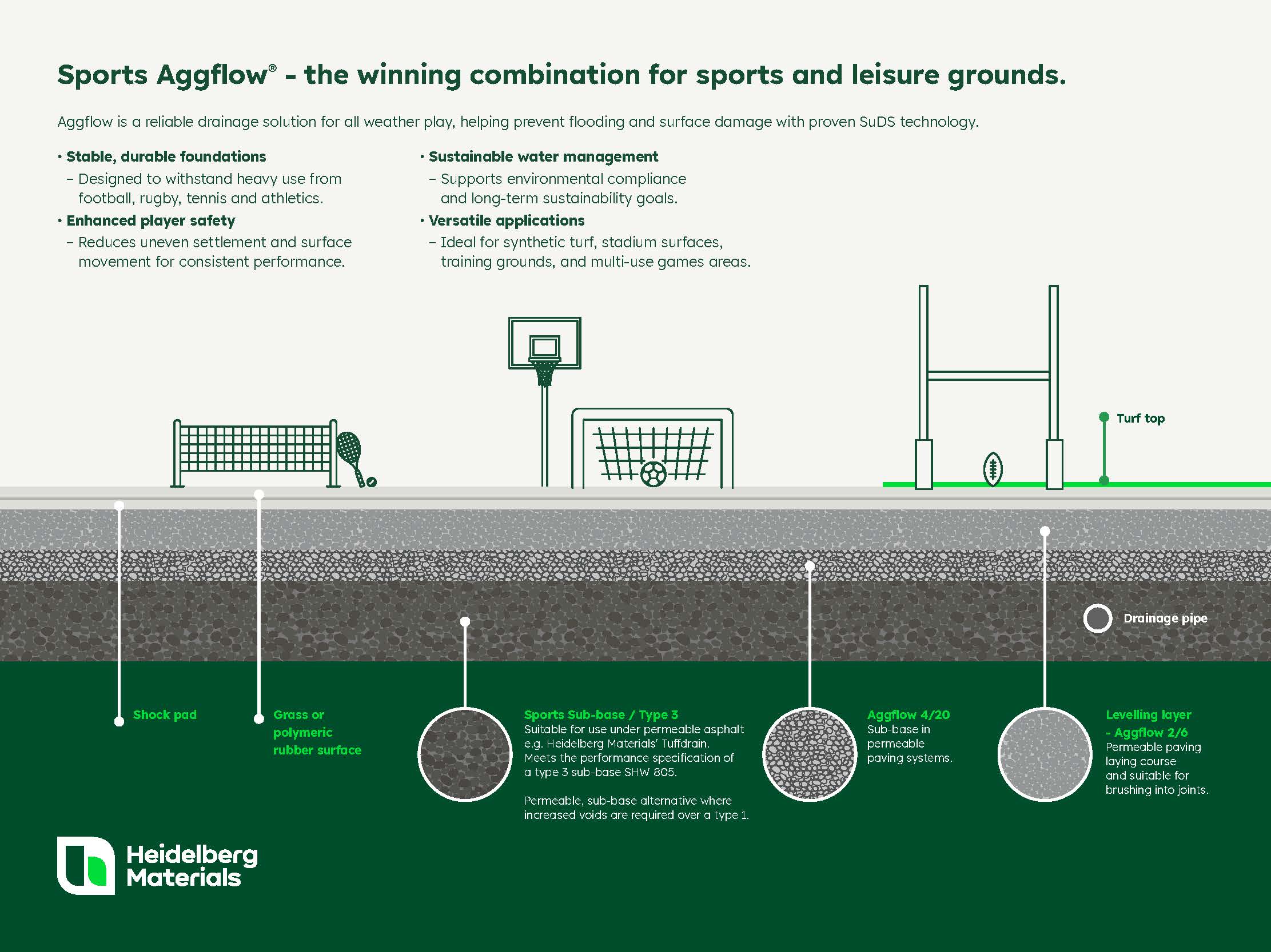 Heidelberg Materials’ Aggflow system is a proven Sustainable Drainage Solution (SuDS). We designed it to manage water drainage and ensure quick and effective soak away beneath sports and leisure surfaces, commercial paved areas, and other SuDS drainage requirements.