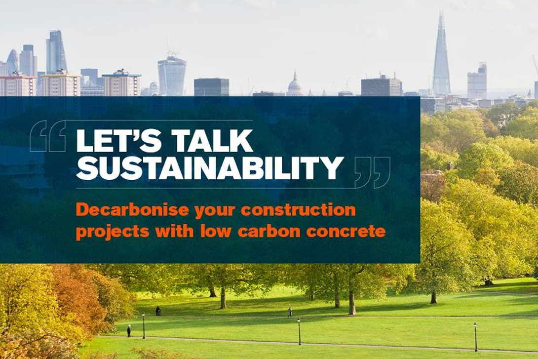 Promotional banner with text '"Let's talk sustainability" Decarbonise your construction projects with low carbon concrete' overlaid on a green park and London skyline background.